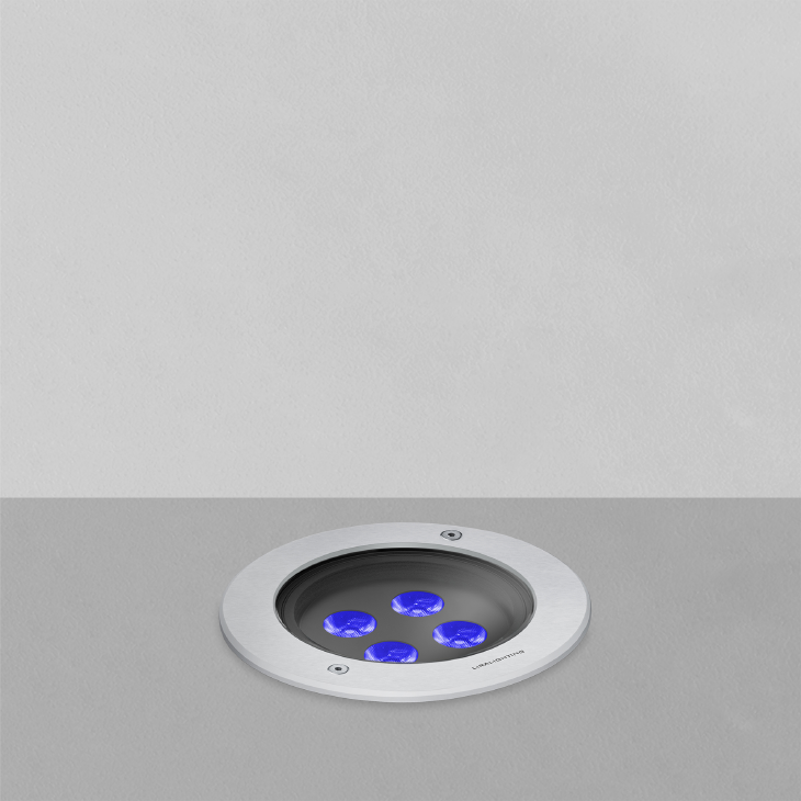 INX 175 RGBW In-Ground is a recessed luminaire intended for installation in a dedicated mounting box. Equipped with 8 mm tempered glass, it offers high resistance to pressure and mechanical damage and is rated for loads of up to 5 tonnes at 30 km/h.