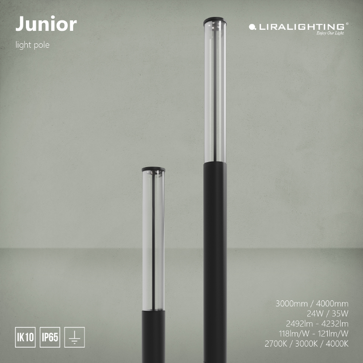 Słupek JUNIOR występuje w dwóch wariantach wysokości 3000,4000mm. Kąt rozsyłu światła – pełne 360°. Doskonale sprawdzi się w różnych przestrzeniach publicznych i prywatnych typu: parki, skwery, osiedla mieszkaniowe, deptaki, promenady, parkingi itp.